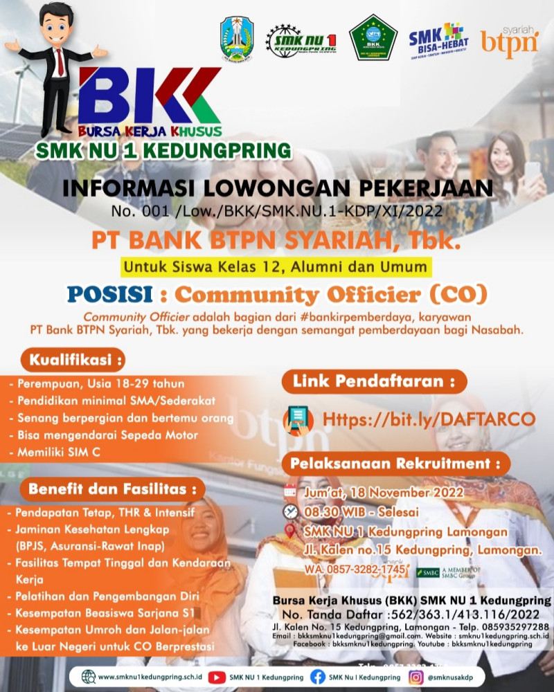 Bagi para SISWA KELAS 12, ALUMNI & UMUM Bapak Ibu, yang sesuai dengan kualifikasi dan banyak sekali benefit/fasilitas yang diberikan.. monggo barangkali ada alumni atau saudara-saudara terdekat bisa langsung hadir pada saat pelaksanaan seleksi/rekruitment :.